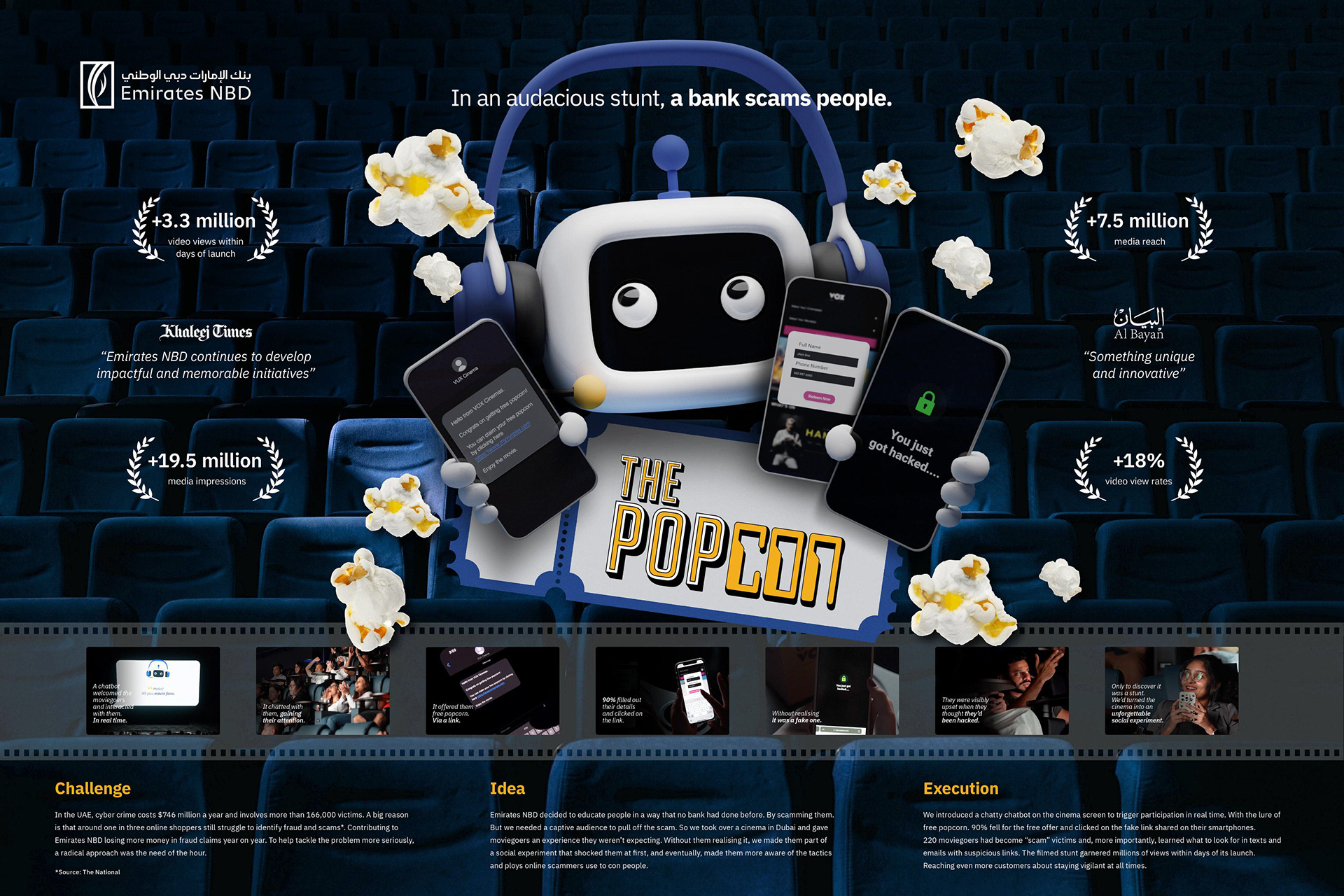 Emirates NBD decided to educate people in a way that no bank had done before. By scamming them. But we needed a captive audience to pull off the scam. So we took over a cinema in Dubai and gave moviegoers an experience they weren’t expecting. Without them realizing it, we made them part of a social experiment that shocked them at first, and eventually, made them more aware of the tactics and ploys online scammers use to con people.