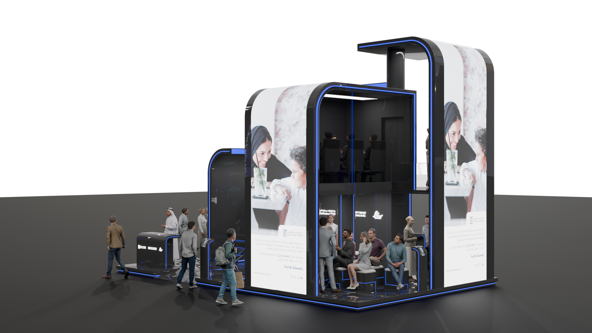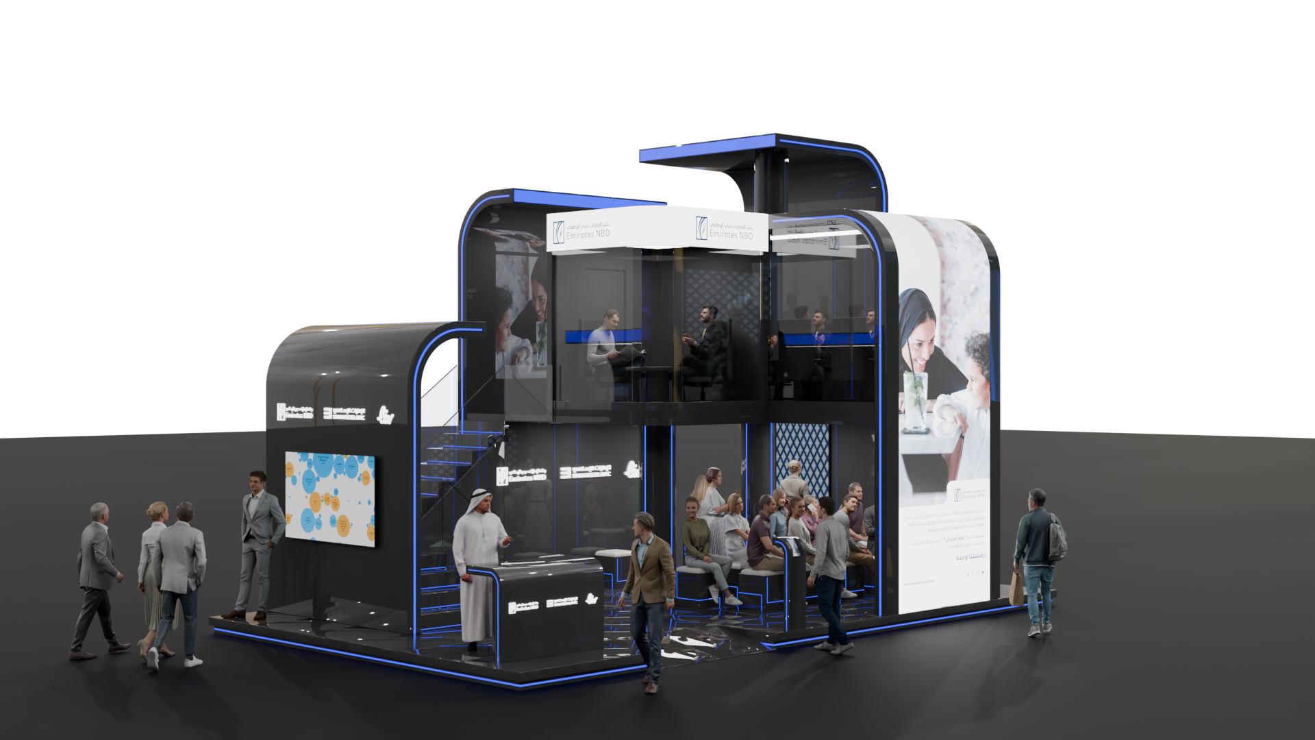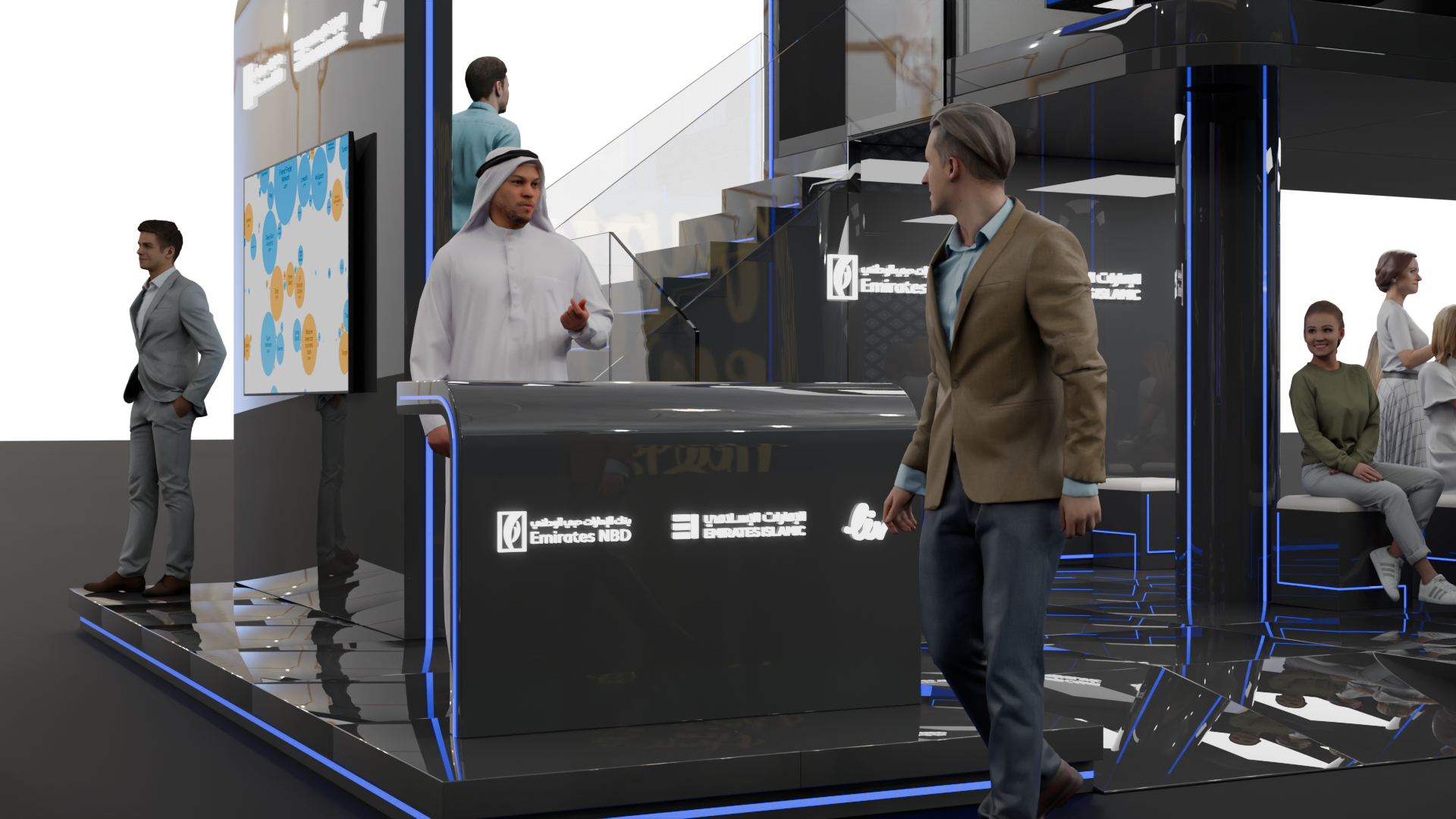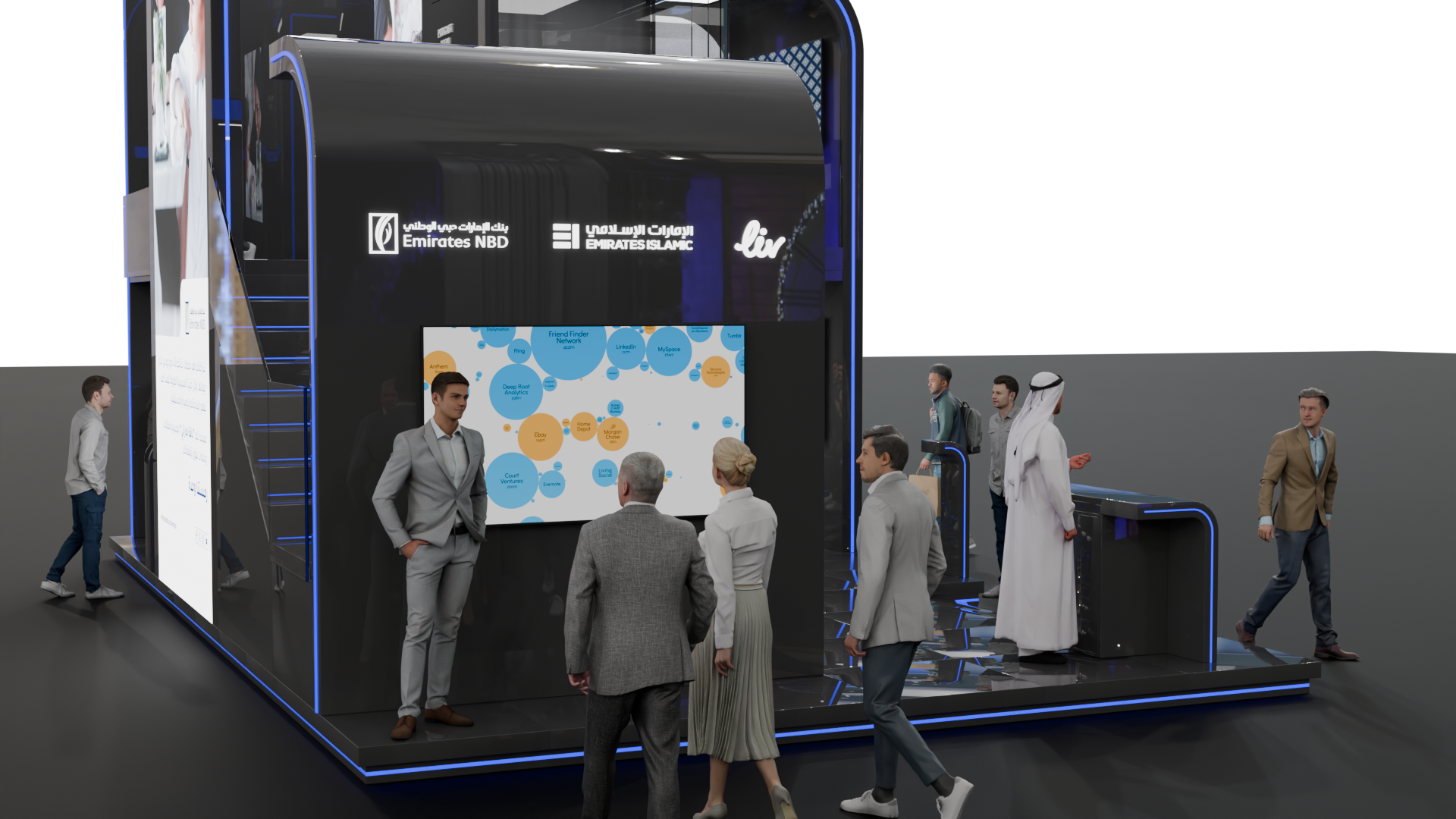 A 15×10 meter stand created for the Emirates NBD group (ENBD, Emirates Islamic, and LIV) designed with a dynamic LED and screen-driven system that transforms the space every 30 seconds, seamlessly rebranding the environment to reflect each entity.
