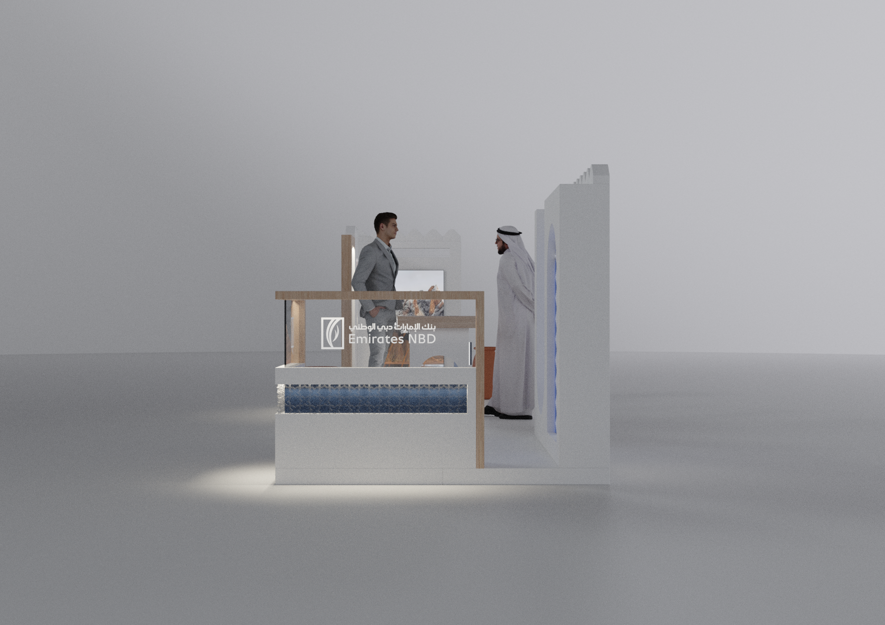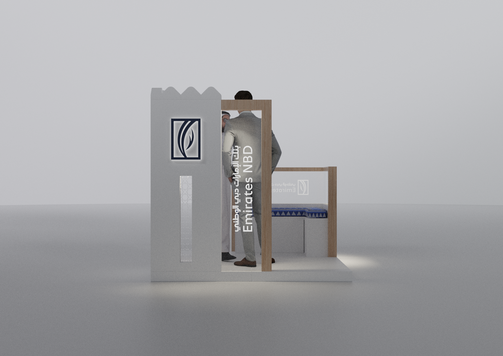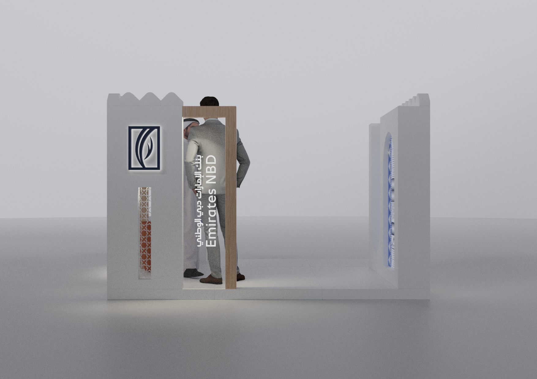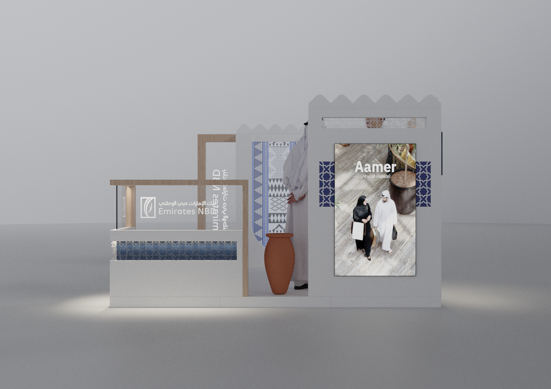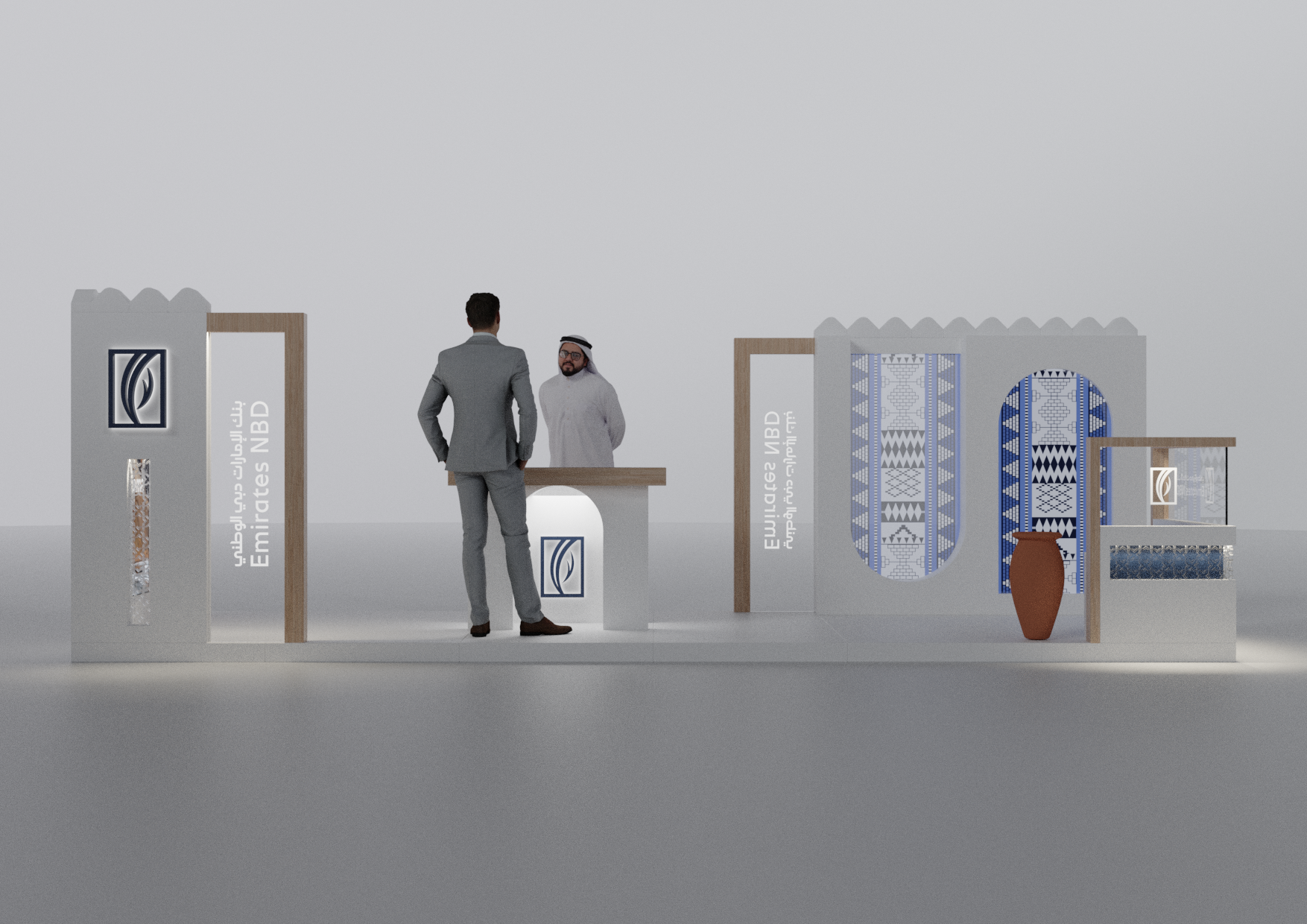 A modular Emirates NBD stand designed with a modern Emirati aesthetic, crafted to adapt seamlessly across 2×2, 3×3, and 2×6-meter layouts while blending cultural elements with contemporary brand expression.