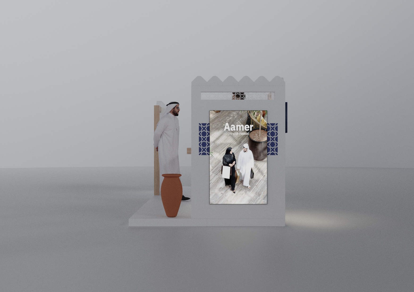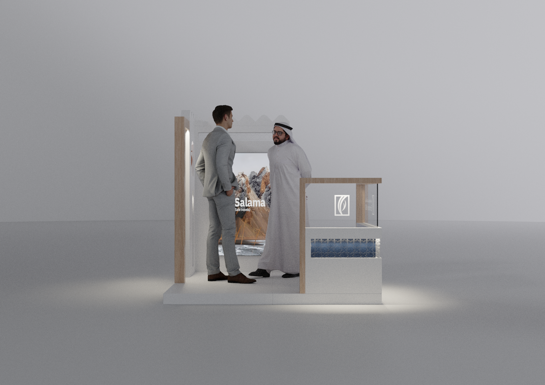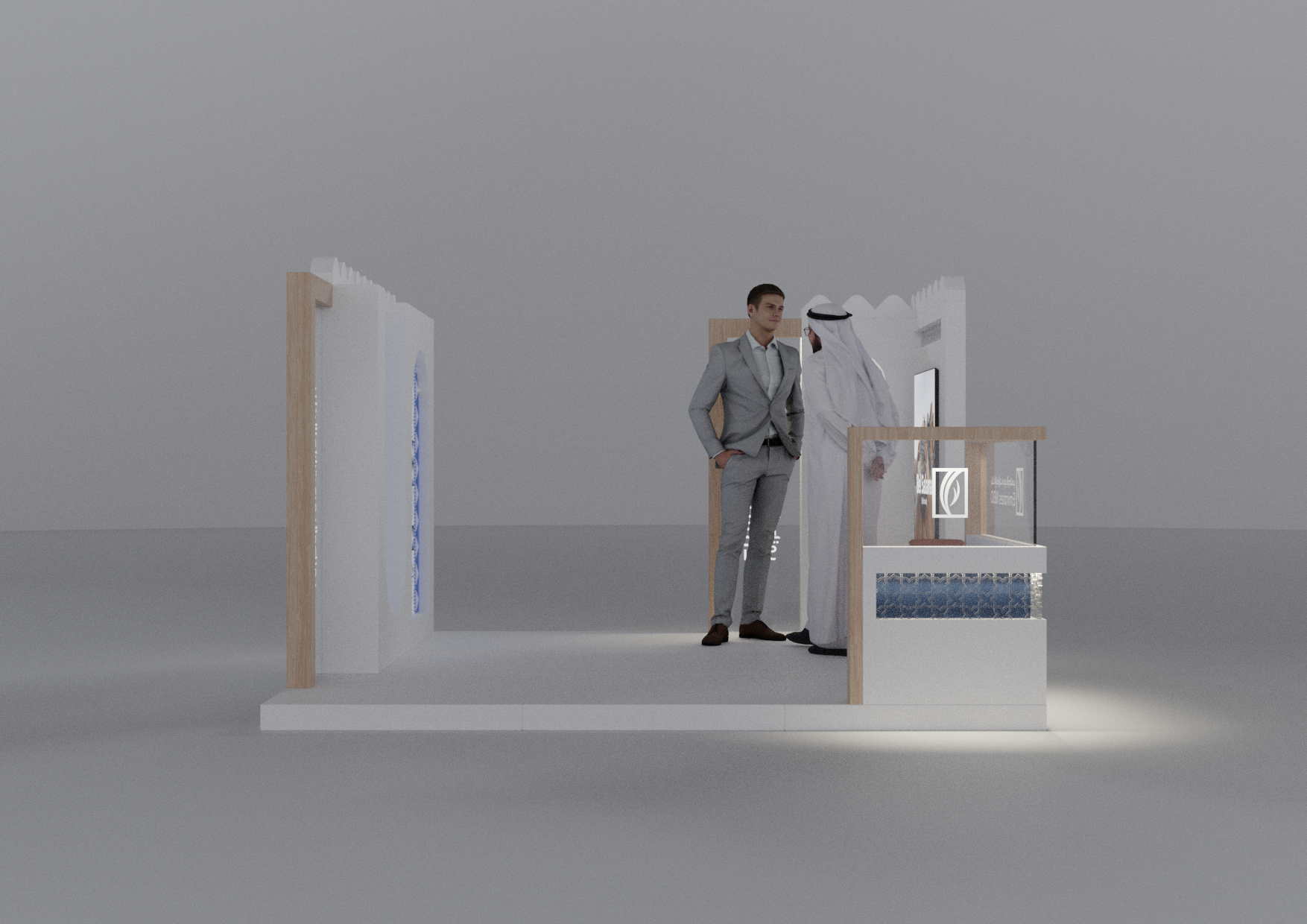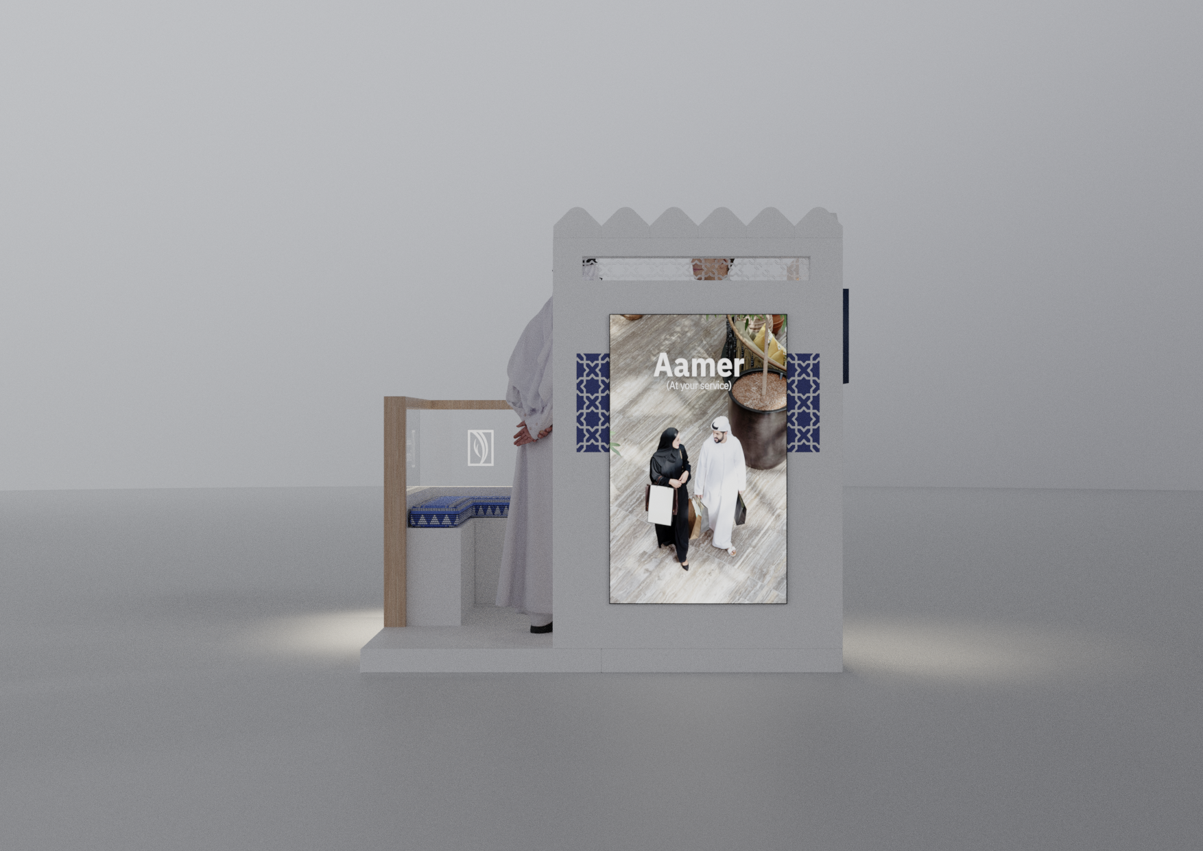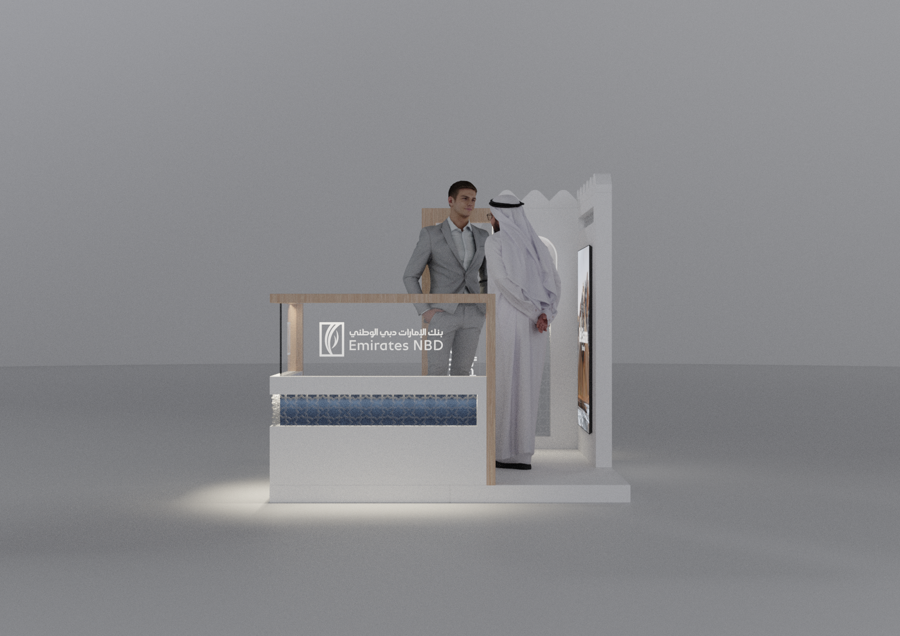 A modular Emirates NBD stand designed with a modern Emirati aesthetic, crafted to adapt seamlessly across 2×2, 3×3, and 2×6-meter layouts while blending cultural elements with contemporary brand expression.
