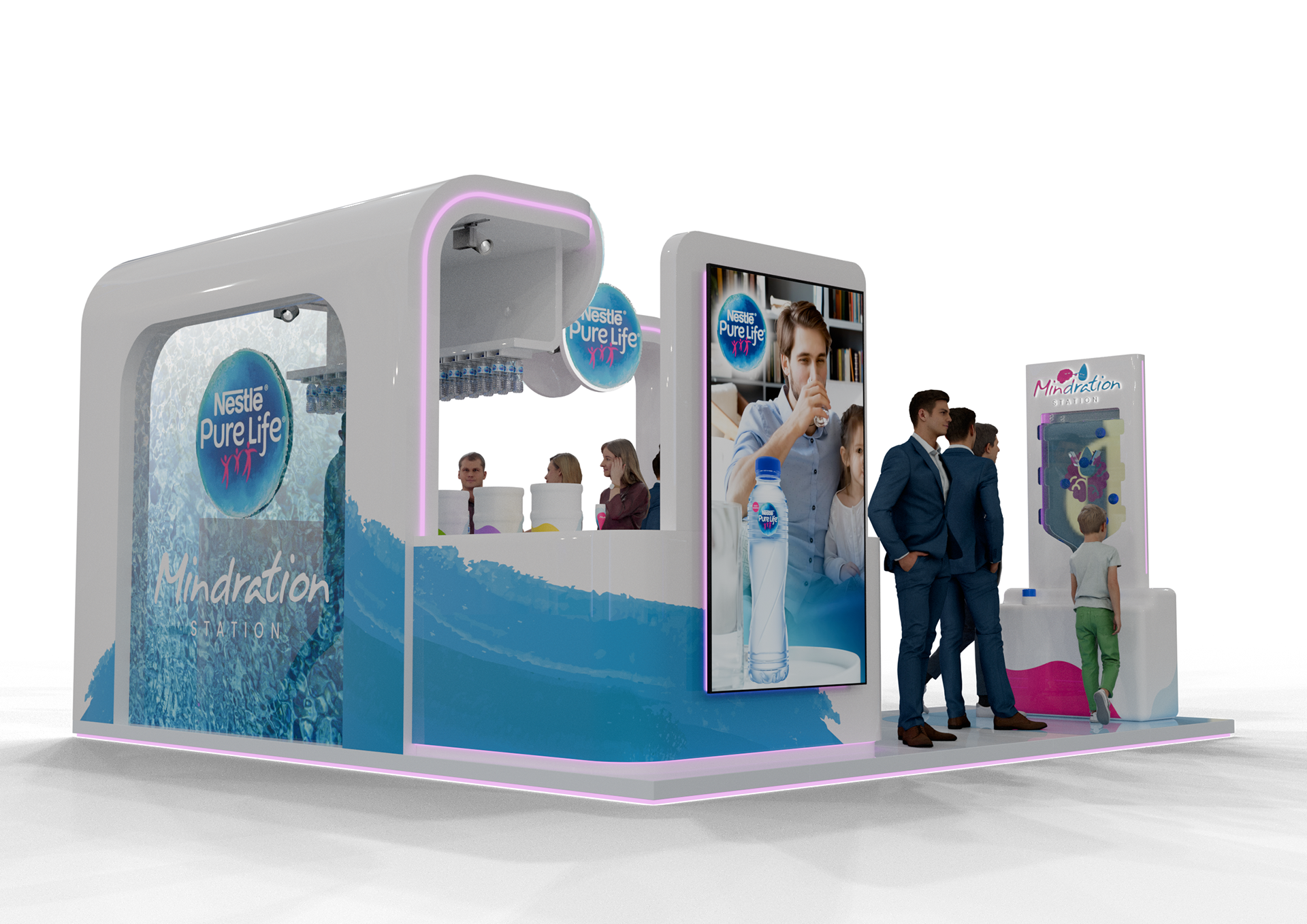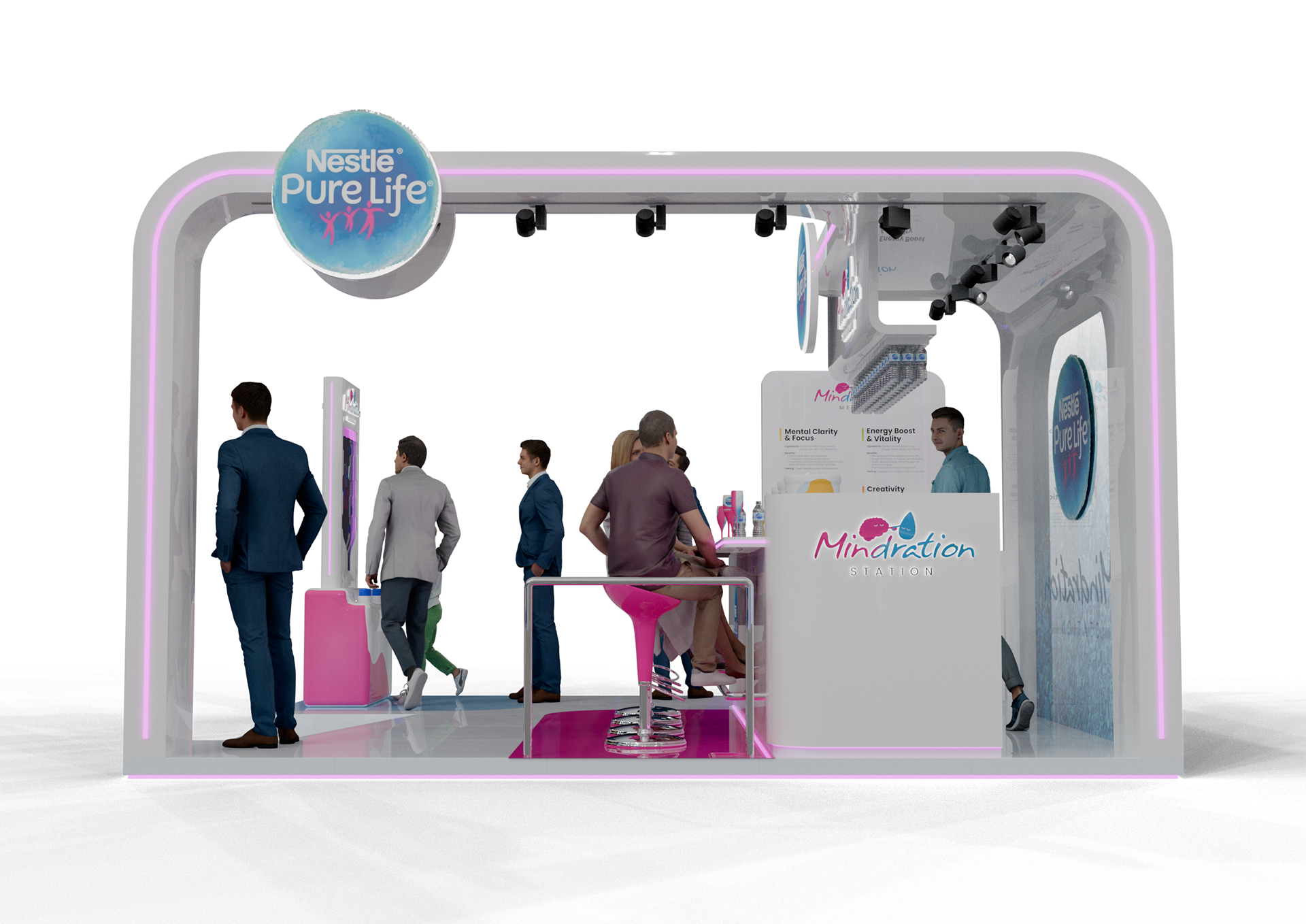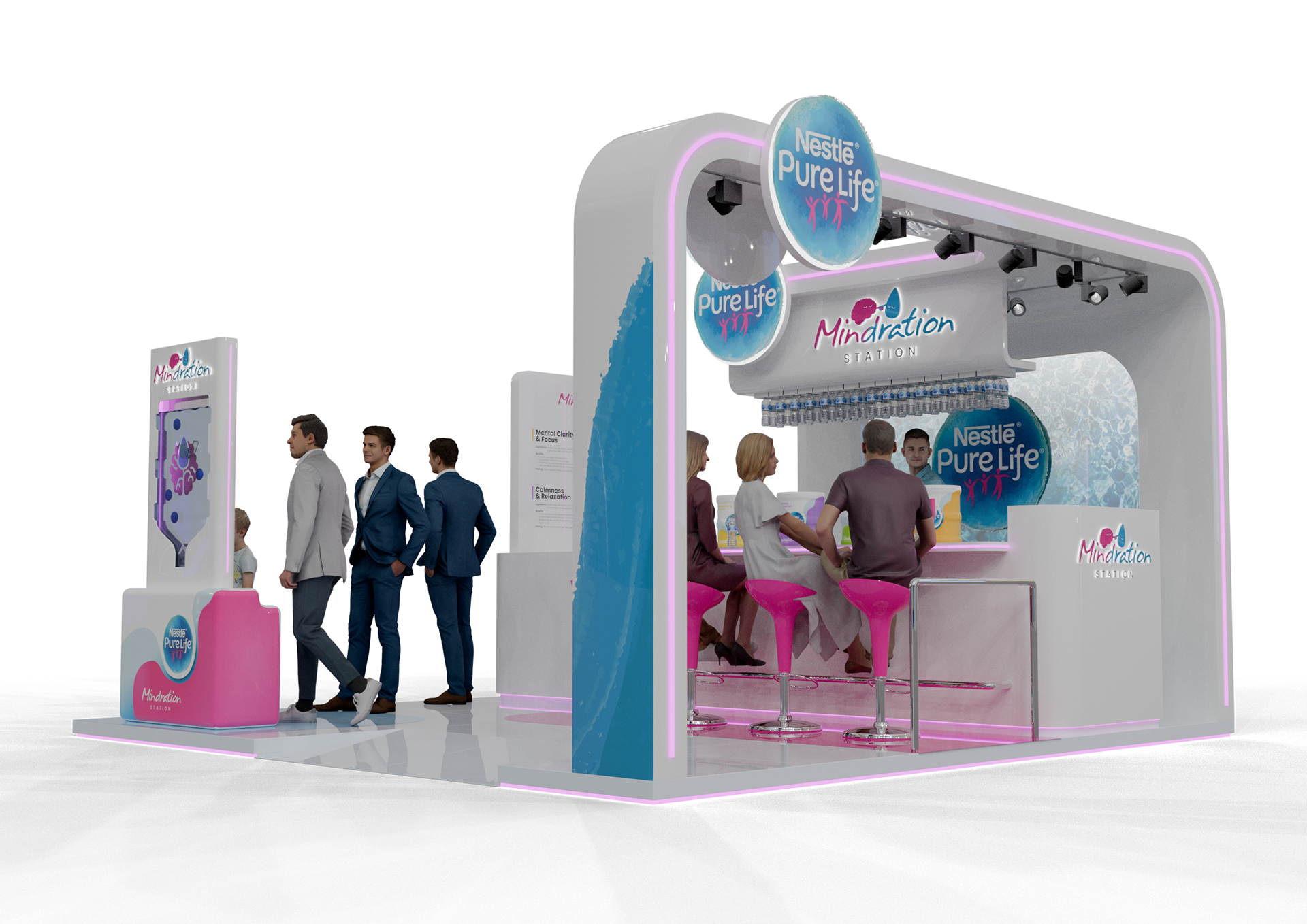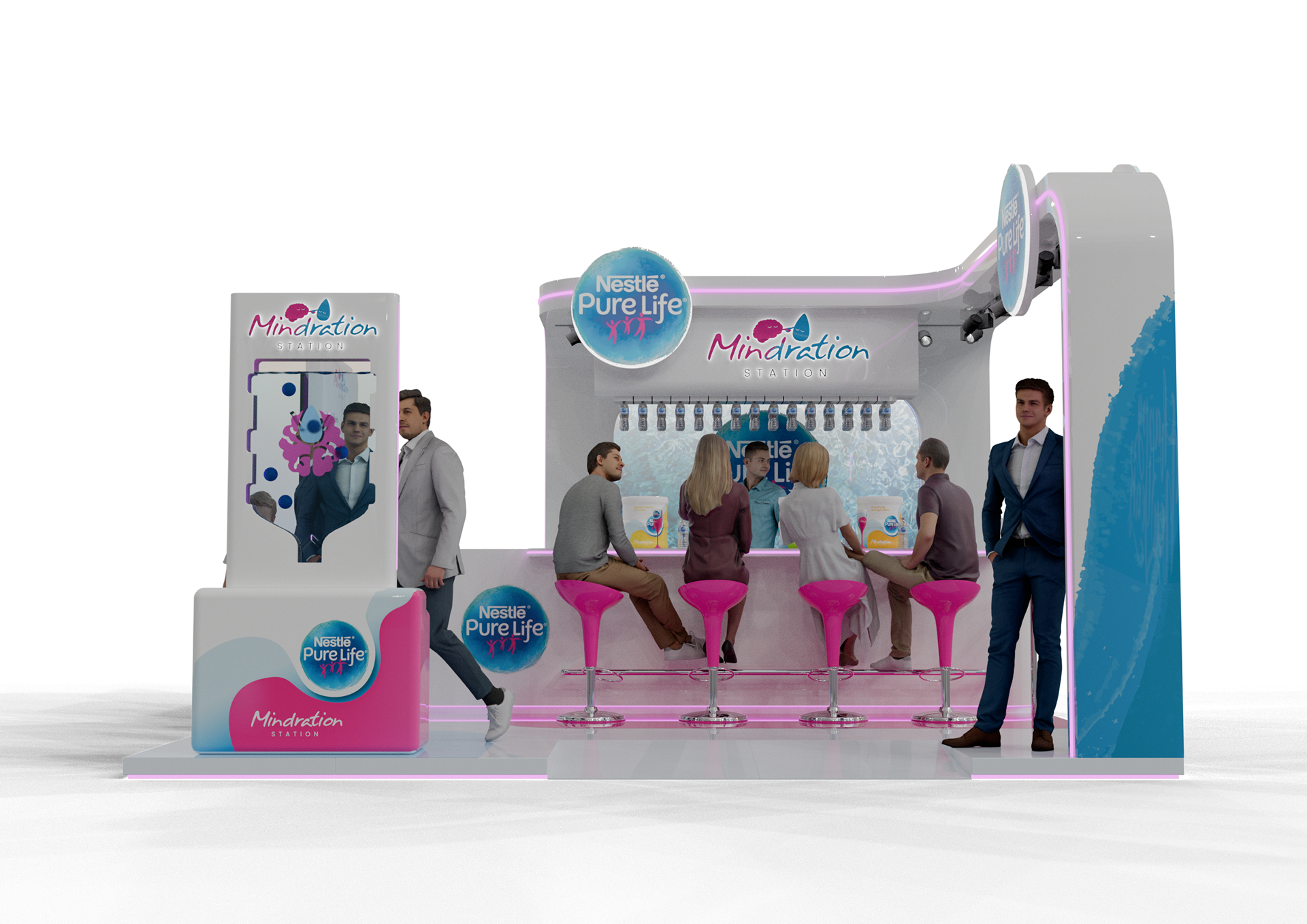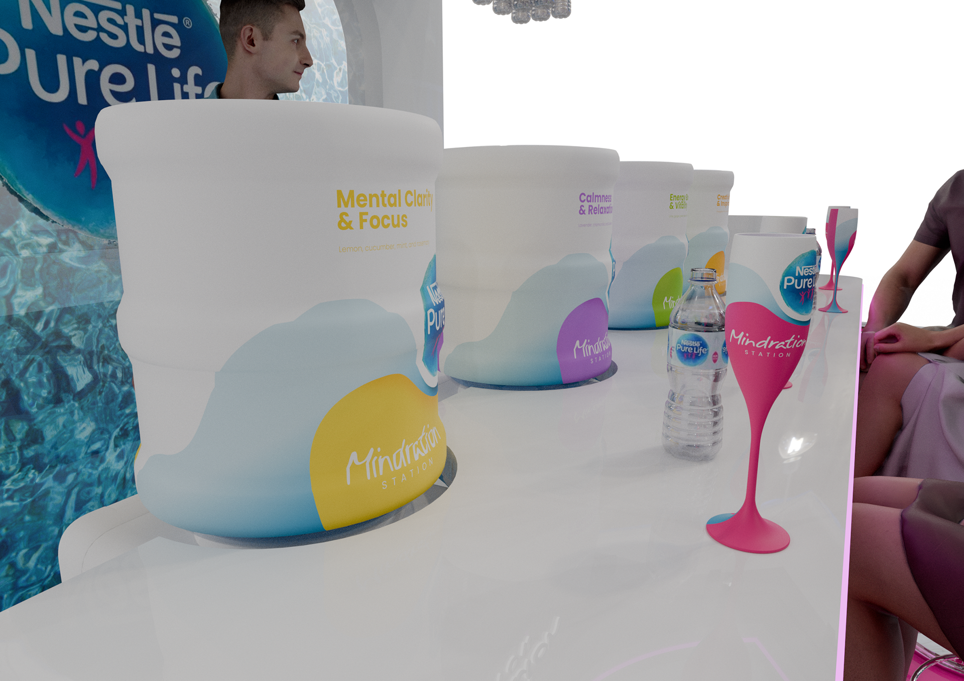 A vibrant experiential stand created for Nestlé Pure Life at Taste of Dubai, built around the ‘Mindration’ concept with flavored mocktail water stations and engaging activation games to immerse visitors in a refreshing brand experience.