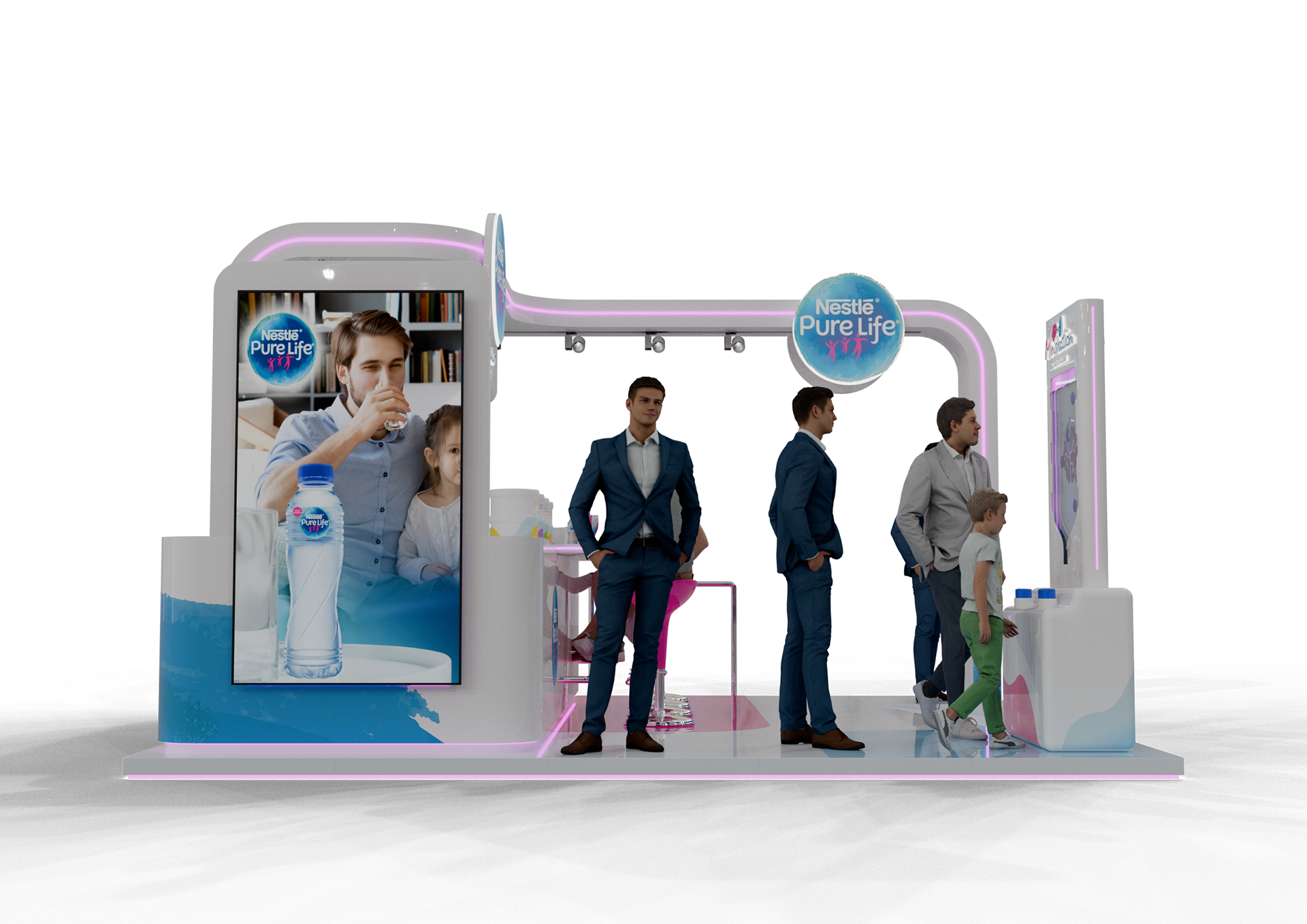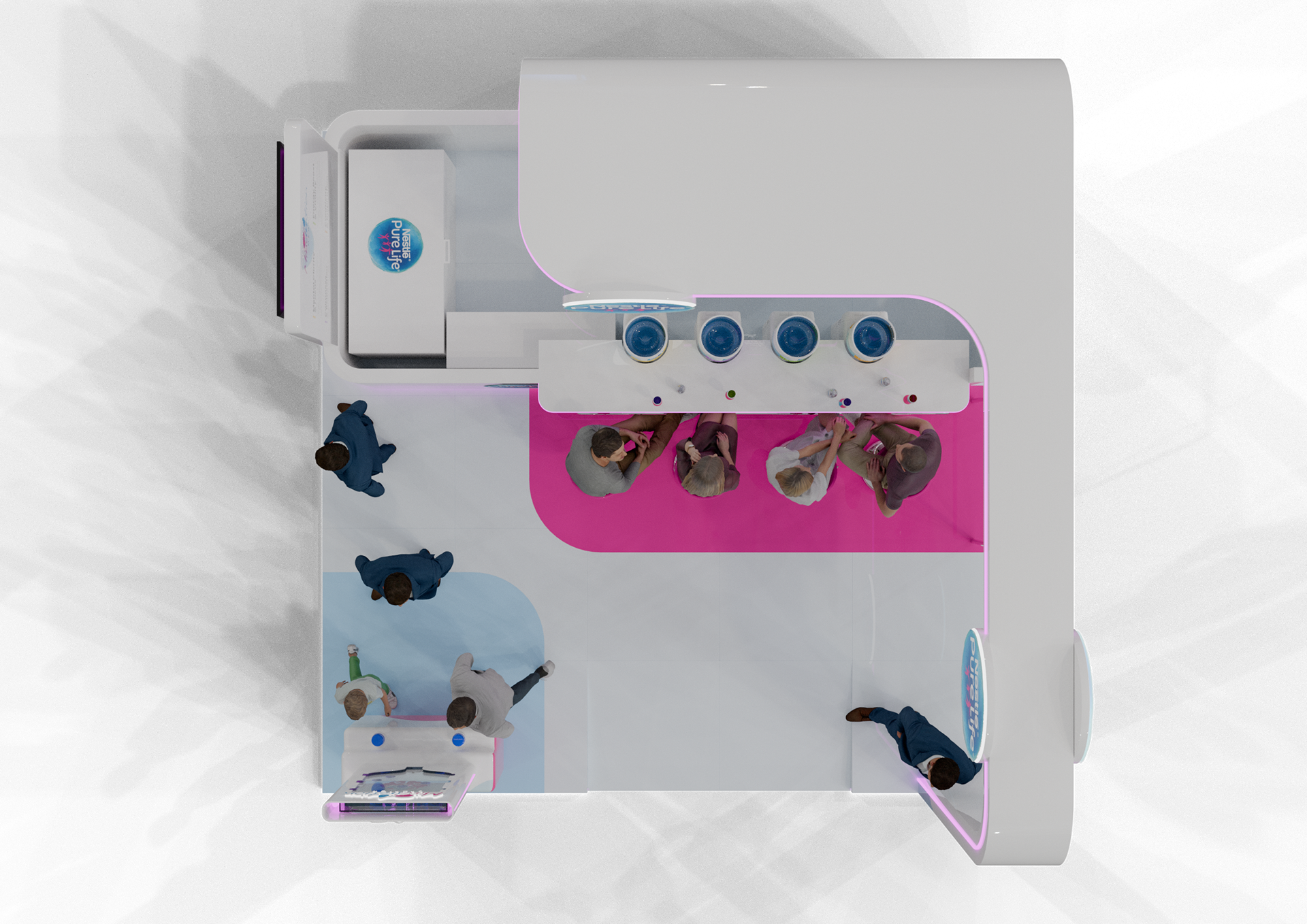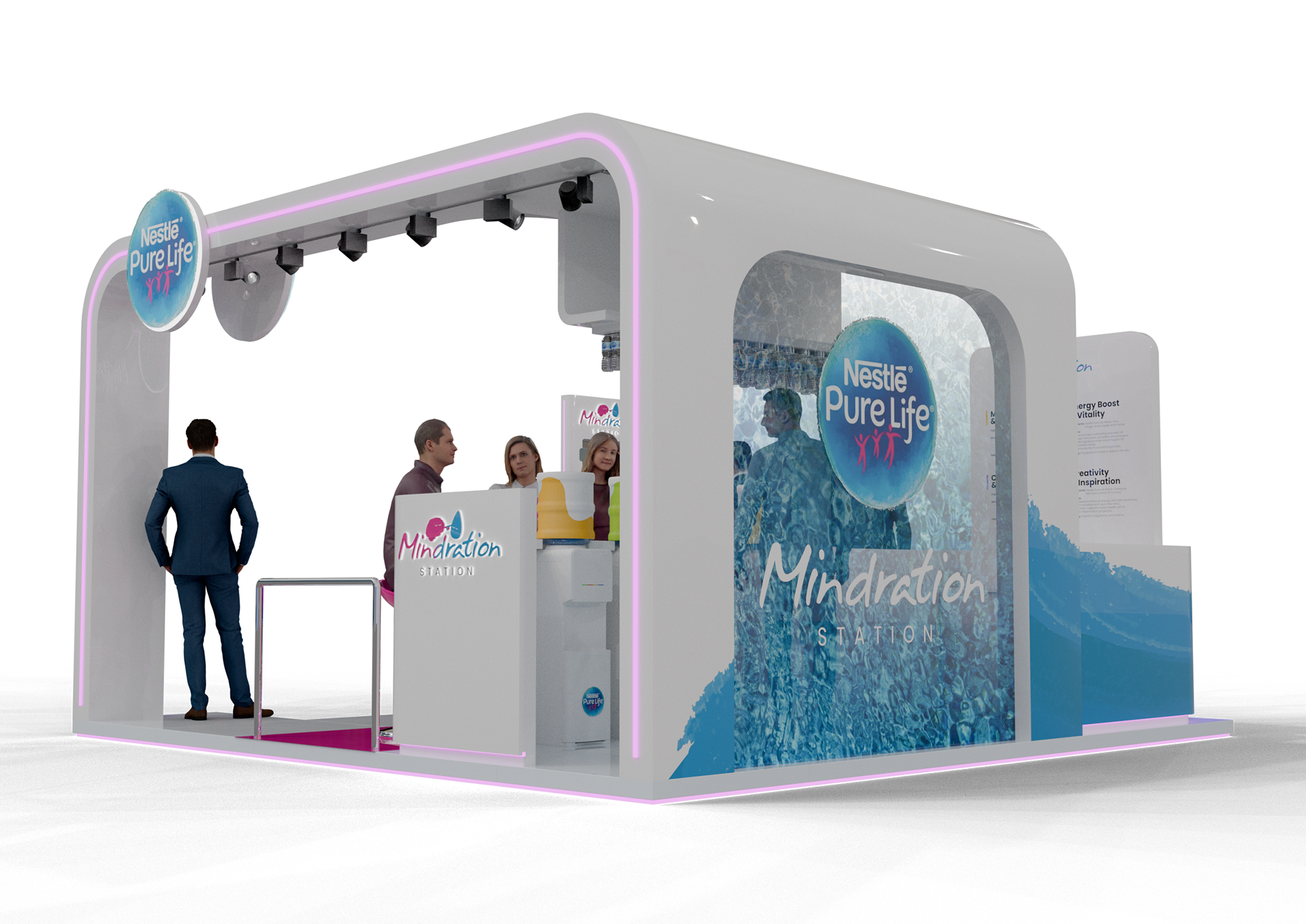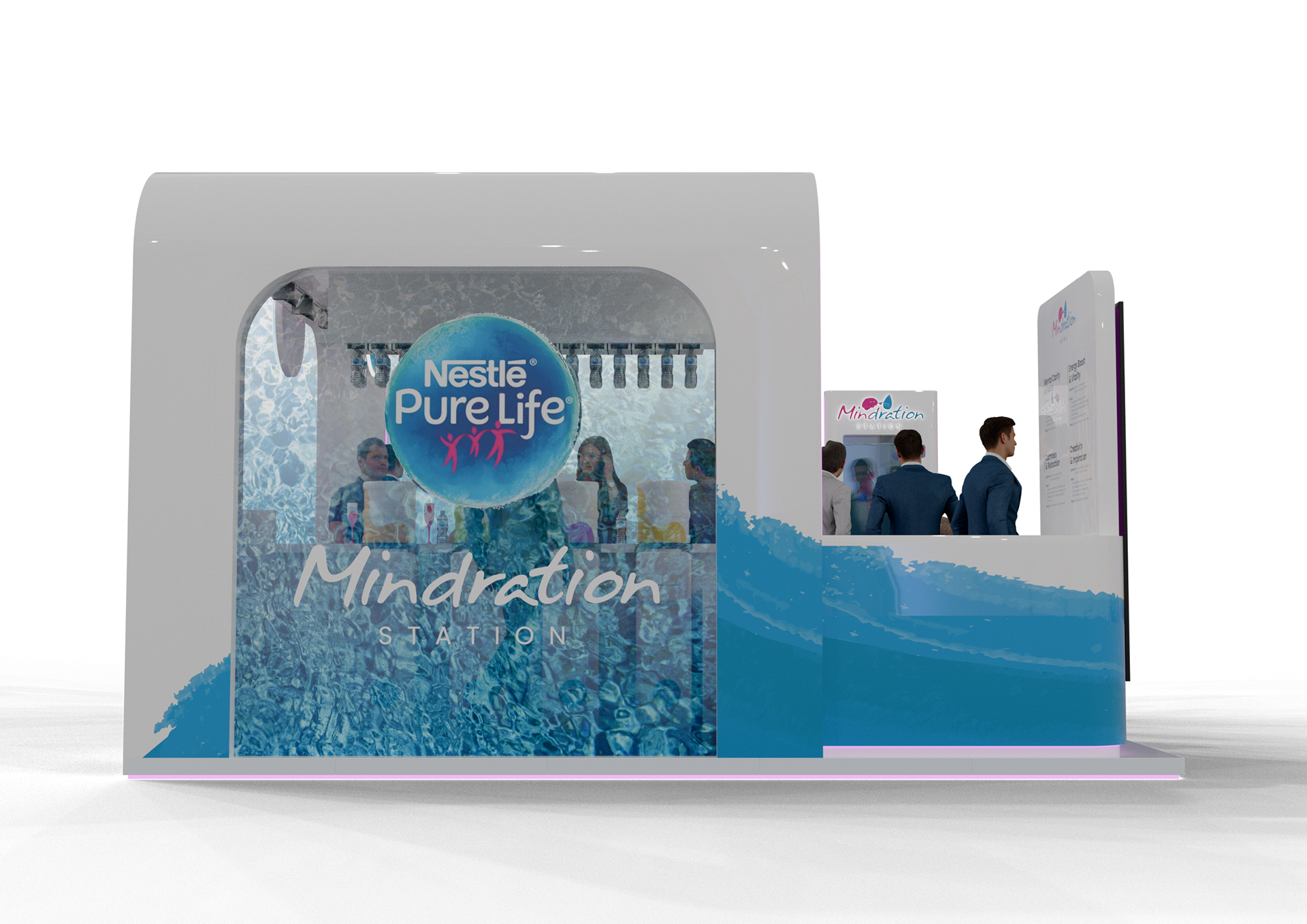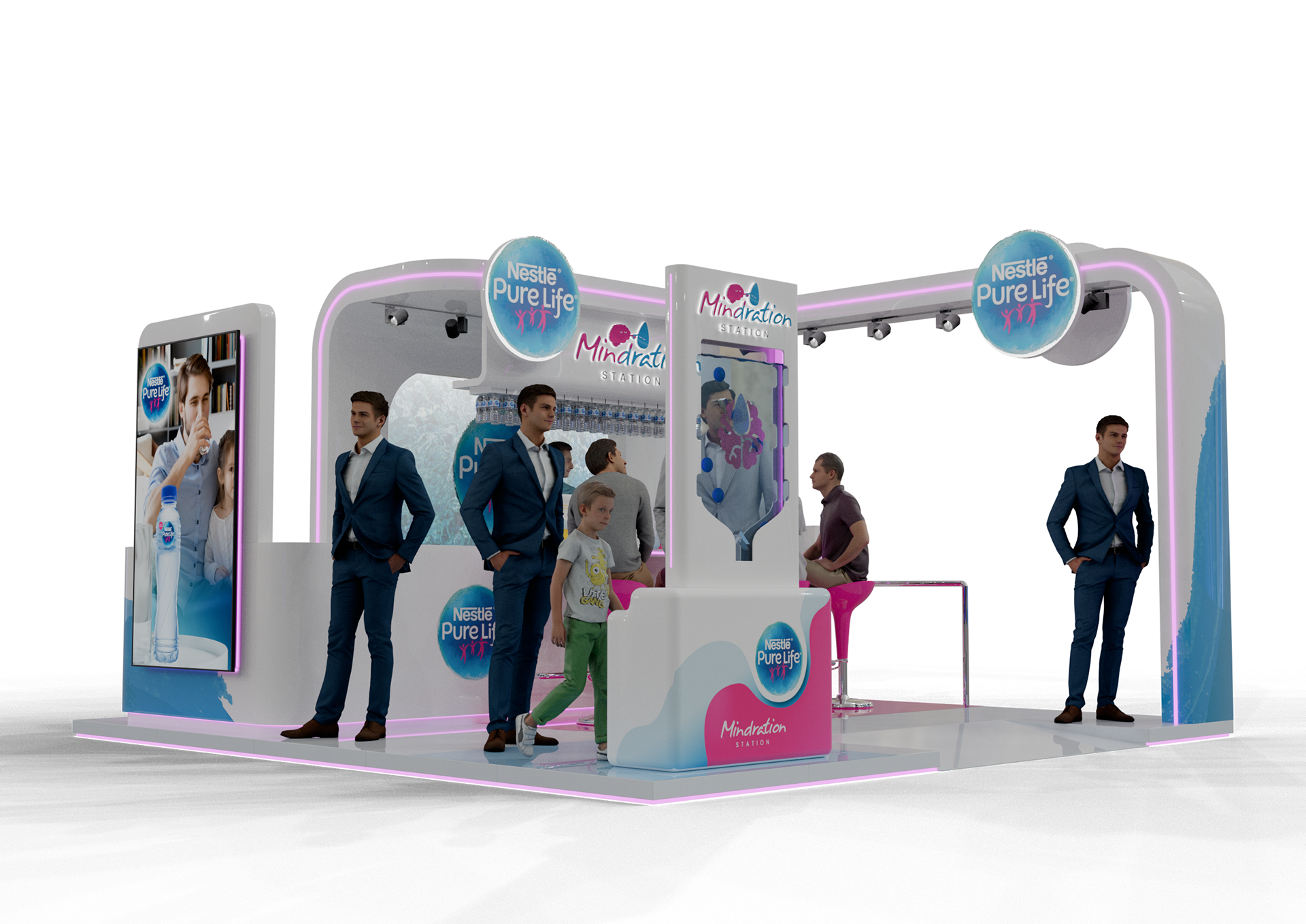 A vibrant experiential stand created for Nestlé Pure Life at Taste of Dubai, built around the ‘Mindration’ concept with flavored mocktail water stations and engaging activation games to immerse visitors in a refreshing brand experience.